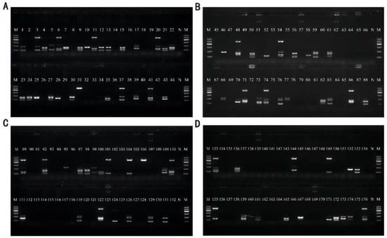 Results of artificial contamination of samples. Lane M: DNA marker B 600; Lane N: Negative control group without the addition of DNA template for amplification. (A) Sample basa catfish for Lane 1–22 and sample beltfish for Lane 23~44; (B) Sample River shrimp for Lane 45~66 and Sample Sea shrimp for Lane67~88; (C) Sample scallops for Lane 89~110 and Sample oysters for Lane 111~132; (D) Sample seaweed for Lane 133~154 and Sample skunk cabbage for Lane 155~176.