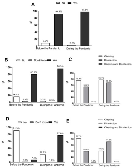 Data showed that 91.8% and 97.8% of the studied population reported the habit of washing hands before and during the pandemic, respectively. Thus, hand washing was a common practice among the studied population and was performed with even greater success during the pandemic (Figure 1A).