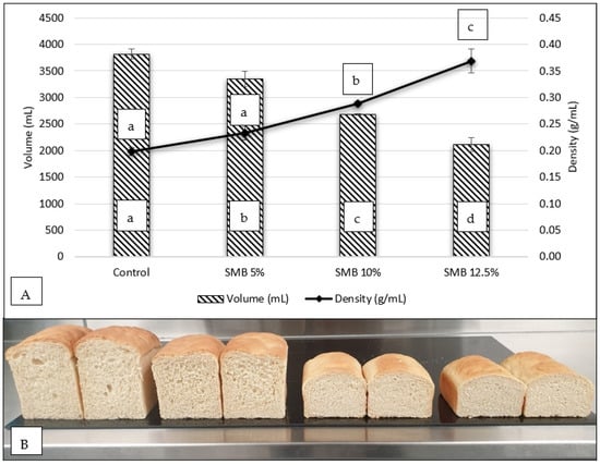 (A) Substitution of SMB100 flour in white bread, formulated with 0%, 5%, 10% and 12.5% and its impact on volume, relative density, and water activity. (B) White wheat bread loaves formulated with SMB100 flour (left-right), control (0%), 5%, 10% and 12.5%. Results are means ± standard deviations. Results from same test not sharing similar letters are statistically different (p < 0.05).