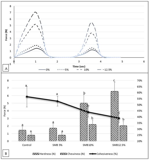 (A) Textural profile analysis graph (Force (N)/Time (second)) of white bread formulated with 0%, 5%, 10% and 12.5% SMB100 flour. (B) Textural results for hardness (N), chewiness (N) and cohesiveness (%). Results are presented as mean (n = 9) ± SD, with different connecting letters for the same test are considered statistically different (p < 0.05).