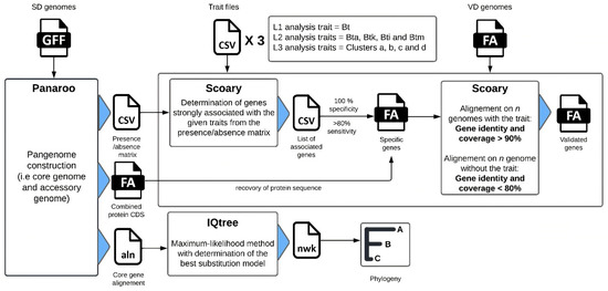 An analysis was carried out to deduce the pangenome (i.e., core and accessory genes) from all 230 SD genomes (Figure 1). The whole genome annotation of the assembly was performed using Prokka v1.13.3 [33] with default parameters, and GFF3 files were provided to Panaroo v1.2.3 [34] as input. Panaroo was run using the strict mode with default identity parameters and length difference thresholds (98%), for initial clustering of protein sequences with CD-HIT v4.8.1 [35]. Then, close clusters were collapsed into putative families when they had at least 70% sequence identity. The assignment of a gene cluster to a core genome was defined by the presence of the gene in at least 99% of the genomes (n = 228). As output, Panaroo produced a presence/absence matrix, used for the pan-GWAS analysis.