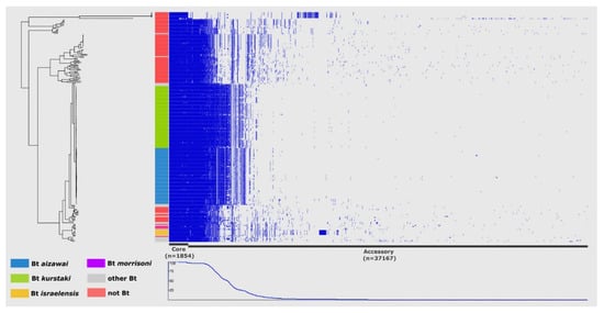 The Bt species is defined here by the presence of Cry/Cyt toxin encoding genes, leading to the release of insecticidal crystals during sporulation. To identify specific Bt markers associated with different traits of interest (Bt species, Bt subspecies Bta, Btk, Bti and Btm, and Bt clusters a to d) using a pan-GWAS approach with Scoary, the pangenome of the Bc group was inferred using Panaroo on SD, resulting in a total of 39,021 clusters of genes. The core genome of the 230 Bc complete genomes was composed of 1854 genes (representing about 5% of all genes), leaving 37,167 accessory genes (Figure 2). Among the accessory genes, 1695 were considered soft core genes (present in 95 to 99% of all genomes), 4358 shell genes (present in 15 to 95% of all genomes) and 31,114 cloud genes (present in less than 15% of all the genomes). A rarefaction curve of the 230 genomes (Supplementary Figure S1) suggests the existence of an open pangenome, as previously assumed for Bc [23,45]. The presence–absence matrix showed that the B. cytotoxicus population, which roots the tree, seemed to possess a reduced number of accessory genes. In contrast, the Bta and Btk subspecies, whose genomes represent highly conserved populations, displayed a greater number of accessory genes.