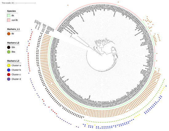 The 14 Bt-specific markers identified with the three levels of GWAS analysis and validated by TBLASTN were mapped on the phylogenetic tree (Figure 3). Despite the great distance between some Bt strains, a combination of six markers can identify all of them. Similarly, with two markers specific to Btk and cluster b, all associated genomes can be retrieved. Only one marker was needed for the identification of Bta, clusters a, c and d.