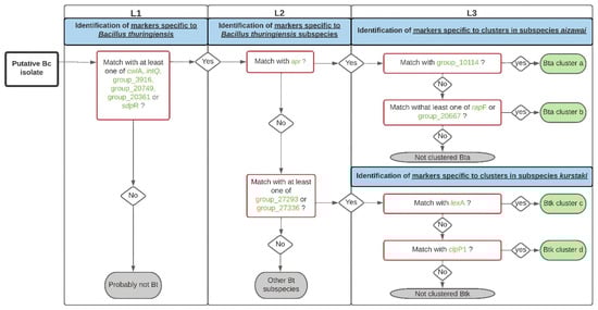 Workflow for Bacillus thuringiensis (Bt) identification. The proposed decision tree is used to determine if a putative Bacillus cereus (Bc) isolate belongs to the Bt species (L1), to the Bt ssp. kurstaki (Btk) or aizawai (Bta) subspecies (L2) and to the clusters a, b, c, and d (L3), based on the 14 marker protein sequences previously identified (see Table 3). A marker is considered present when its sequence coverage and its identity are both higher than 90% in the assembly tested.