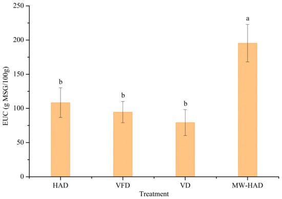 The umami taste of edible mushrooms could be enhanced by the cooperative effect of MSG-like amino acids and 5′-nucleotides [5,38]. The EUC value was used to evaluate the synergistic effect on umami character. From Figure 1, the EUC values of dried Cordyceps militaris ranged from 79.30 to 195.43 g MSG/100 g. EUC values could be divided into four levels on the basis of MSG/100 g: <10 g, 10–100 g, 100–1000 g, >1000 g [39]. EUC values of VFD and VD samples were at the second level. HAD and MW-HAD treatment increased the EUC values to the third level. As stated previously, Cordyceps militaris dried by HAD had the most MSG-like amino acids. MW-HAD generated the highest content of 5′-AMP and 5′-GMP. Among the four samples, Cordyceps militaris treated by MW-HAD had the highest EUC value of 195.43 g MSG/100 g, which indicated that MW-HAD was a potential drying technology for enhancing the umami intensity of dried Cordyceps militaris.
