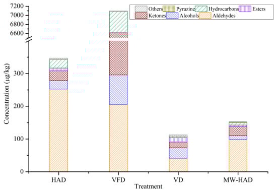As shown in Table 3 and Figure 2, 93 flavor substances were identified in dried Cordyceps militaris, including 19 aldehydes, 12 alcohols, 20 ketones, 14 esters, 20 hydrocarbons, 3 pyrazines, and 5 others. The total concentration of all flavor substances was different in samples processed by different drying methods. For VFD process, 38 flavor substances were identified, and the amounts of total volatiles were significantly higher than those in other dried samples. We could conclude that VFD treatment contributed to the retention of flavor substances in Cordyceps militaris. In our study, 1-octen-3-one, 3-octanone, and 1,3-octadiene were the most plentiful components in VFD samples which accounted for 93.95% of the total concentration of volatiles. Our result was similar to the previous study that 1-octen-3-ol, 3-octanone, 1,3-octadiene, and 3-octanol were detected as the most abundant components in freeze-dried Cordyceps militaris [20]. There were 51, 61, and 60 kinds of flavor substances detected in HAD, VD, and MW-HAD samples, respectively. VD-treated samples showed a lower concentration of total volatiles compared with those of HAD samples at a constant temperature, indicating that the vacuum process promoted the degradation or evaporation of flavor substances.