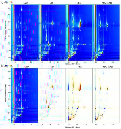The different comparison model was carried out to differentiate the four dried samples. The HAD sample was taken as the control, and all the other samples were deducted from the control (Figure 3B). If the flavor components were consistent, the background was white, while a red color represented that the intensity of the compound was higher than that in the control, and blue color represented lower. As shown in Figure 3B, the concentration of VD volatiles was lower than that of the HAD sample, while the concentration of VFD and MW-HAD volatiles was lower than that of the HAD and also somewhat higher than the HAD sample within the drift time of about 1.0. When the drift time was in the range of 1.0–1.5, the concentration of most of VFD volatiles was significantly higher than that of the HAD sample, while the concentration of most of VD volatiles was lower than that of the HAD sample. In addition, most of the signals in the four dried Cordyceps militaris samples were located at the retention time of 100–300 s, and some of them appeared at the retention time of 500–700 s. It was reported that non-polar substances retained longer on non-polar columns than polar substances [42]. The concentration of some non-polar compounds in the VFD process was higher than that observed in other treatments. In all the four drying methods, the concentration of most of the VFD volatile compounds was higher than that of other drying methods. The improved intensity of some signals indicated that VFD treatment could better preserve the flavor compounds, which was consistent with the GC-MS results.