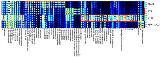 In the fingerprint plot, each row represents the signal peaks (volatile compounds) detected in one sample, and each column exhibits the difference of flavor component in different samples. As shown in Figure 4, limonene, 2-methylbutanal, 3-methylbutanal, 2-butylfuran, (E)-2-hexenal, (E)-2-octenal, and isobutyl butyrate were detected in all the four dried samples. Among these substances, the concentration of limonene, (E)-2-octenal, and isobutyl butyrate in VFD samples was relatively higher than those in other samples. Phenylacetaldehyde and one unidentified compound (11) with higher signal intensity were detected in both VFD and MW-HAD samples and marked as the purple region of their characteristic aroma compounds. 1-Octen-3-ol, ethyl 3-methylbutyrate, 2-pentylfuran, butyl formate M, butyl formate D, hexanal M, hexanal D, 2-butanone, pentanal M, pentanal D, 2-heptanone, octanal, heptanal M, heptanal D, (E)-2-heptenal M, (E)-2-heptenal D, nonanal M, and nonanal D were detected in HAD samples and labelled as the orange region of the samples’ characteristic compounds. A similar result was found in the report of Hou et al. [23], which showed that HAD treatment could increase the content of aldehydes (such as pentanal, hexanal, heptanal, (E)-2-heptenal) in dried shiitake mushrooms compared with VFD. 1-Hexanol M, 1-hexanol D, 1-pentanol M, and 1-pentanol D were detected in VD samples and labelled as the green area, which were the characteristic volatiles in the fingerprint plot. From Figure 4, benzaldehyde, ethyl pentanoate, ethanol M, ethanol D, methional, butyl lactate, 1-octen-3-one M, 1-octen-3-one D, ethyl acetate M, ethyl acetate D, 3-octanone M, 3-octanone D, butanal, ethyl propanoate, 3-methyl-2-pentanone, and 5-methyl-2(3H)-furanone were found in VFD samples and labelled as the red area of the samples’ characteristic flavor compounds. Acetone and 2-methylpropanal were detected in MW-HAD samples and marked as the yellow region of this samples’ characteristic substances. Overall, the fingerprint spectra demonstrated that the flavor substances in Cordyceps militaris from different drying methods were obviously different, and VFD samples had a higher abundance of flavor compounds than other samples.