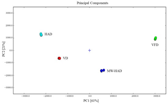 The multivariate analysis of PCA was applied to measure the differences among the four dried Cordyceps militaris samples based on the flavor compounds obtained from GC-IMS (Figure 5). The first two principal components explained 82% of the variation (PC1 explained 61%, and PC2 was 21%), which could reflect the most information relating to the samples. In general, when the distances between samples were far apart, the difference in volatiles was great, and if they were close, the difference was small. According to the distribution of samples, it could be clearly found that HAD, VD, VFD, and MW-HAD samples were well distinguished into four groups in the visualization, and the flavor differences among samples in different drying methods were obvious. VFD could be separated by the positive score values of PC1 and PC2. MW-HAD samples were located in the bottom right area. HAD samples were distributed in the upper left area. VD samples were located in the bottom left area. The results indicated that GC-IMS data could effectively distinguish Cordyceps militaris samples with different drying treatments.