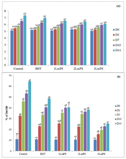 LmPS incorporation effect on (a) pH, (b) metmyoglobin (%), and (c) thiobarbituric-acid reactive substances (TBARS) (mg malondialdehyde/kg) in crude minced meet within a shelf life of 14 days of storage at 4 °C. Mean ± standard deviation (n = 3). Letters a–d: values of the same storage day are significantly different (p < 0.05); letters A–D: values of the same concentration are significantly different.