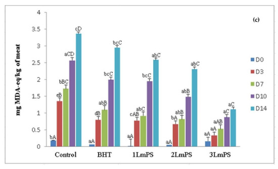 Interestingly, the lowest concentration of LmPS showed the same preserving effect obtained with the BHT formulation. Furthermore, the higher the concentration of LmPS added to the meat, the lower the quality decay rate during storage, suggesting that this polymer may have inhibited microorganism growth and lipid oxidation during the 14 days of refrigerated storage.