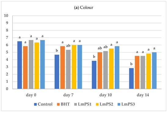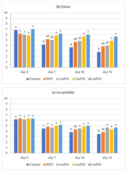 Organoleptic quality ((a) colour, (b) odour and (c) overall acceptability) of raw minced meat beef stored at T = 4 °C, using different preserving agents. In each group (same day of storage) different letters indicate mean values significantly different (p < 0.05).