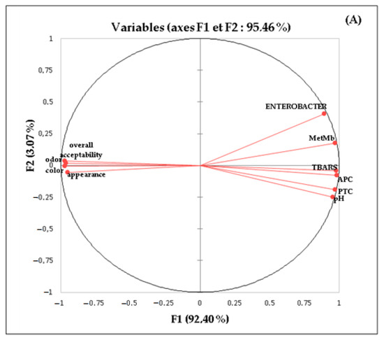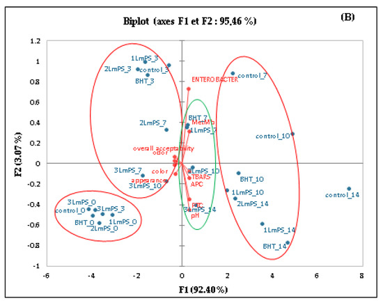 The data concerning the microbial, chemical, and sensory properties of the samples were analysed by PCA. The first component (F1 92.4%) explained most of the information (Figure 3). The (F1) axis (Figure 3A) was significantly correlated to most of the variables (metMb, TBARS, APC, overall acceptability, colour, appearance, and odour). On the contrary, the (F2) axis was more related to Enterobacteriaceae number, pH, and PTC. TBARS were strongly correlated with metMb (Figure 3A). It is reported that peroxyl radicals and oxidized iron, by-products of lipid and myoglobin oxidation, accelerate protein oxidation [54]. In addition, a positive relationship was observed between microbial growth and lipid/protein oxidation measurements. The findings herein are consistent with the effect of protein oxidation on sensory parameters. Based on Figure 3A, it can be suggested that oxidative stability as well as microbial loads played an important role in influencing the samples during storage. The graph concerning the factor scores (Figure 3B) points out a large difference among the 25 samples. Overall, the samples 3LmPS_14, 2LmPS_10, 1LmPS_7 and BHT_7 had low levels of protein oxidation (metMb), lipid oxidation (TBARS) and microbial growth. These samples were the most acceptable for the panellists. In contrast, the control was associated with high levels of lipid oxidation, protein oxidation and microbial growth. It is noteworthy that 3LmPS was more efficient against microbial growth, delaying chemical oxidation, and thus extending the shelf life of ground beef.