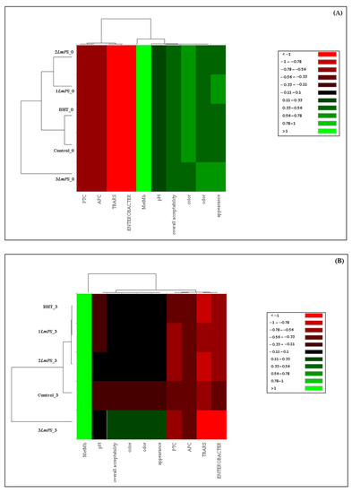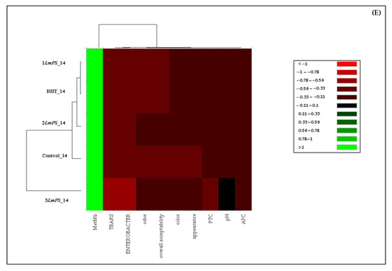 Two-way hierarchical cluster analysis (HCA) of physicochemical, microbial, and sensory characteristics of the control, BHT and different treated samples at each of the storage times: (A) day 0; (B) day 3; (C) day 7; (D) day 10 and (E) day 14.