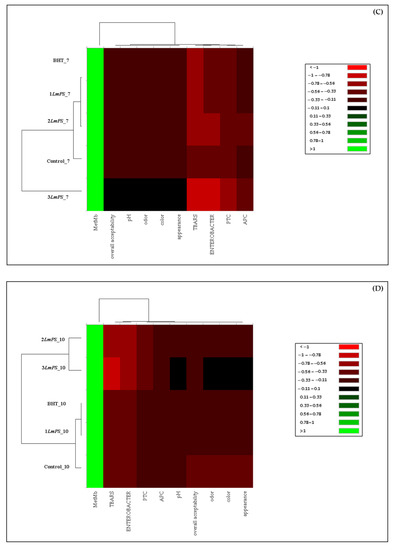Figure 4A shows three different clusters with a significant similarity between control and BHT samples. Thus, 1LmPS_0, 2LmPS_0 and 3LmPS_0 showed dissimilarity in their composition. On days 3 and 7 of storage (Figure 4B,C), the dendrograms evidenced four groups with a high similarity between 1LmPS (0.15% of LmPS) and BHT samples. The 2LmPS, control and 3LmPS samples showed a different variation of the parameters depending on the refrigerated storage. Furthermore, the relationship among microbial contamination, lipid oxidation, protein oxidation, and sensory attributes was also highlighted by these two figures. Our results corroborate those of Kallel et al. [46], who stated that metMb (MbFe3+) can be reduced to native Mb (Fe2+) by Lactobacillus and Staphylococcus, and inhibits unsaturated fatty acid oxidation. Furthermore, an addictive relationship (metMb-sensory qualities) was shown on days 3 and 7 of storage. Nevertheless, on day 10 (Figure 4D) the relation was more marked between TBARS-Enterobacteriaceae, APC-PTC, and sensory qualities. Such data resulted in lipid oxidation, browning reactions caused by non-enzymatic processes, and myoglobin oxidation, which are considered the main factors influencing meat colour [55]. Ben Akacha et al. [6] related sensory properties to microbiological investigations. The high levels of microorganisms and lipid oxidation caused unsatisfactory sensory properties of the untreated meat. On the other hand, the samples treated with essential oil showed significantly satisfactory scores at the odour level due to the astringent properties [13]. Therefore, chemometric tools can be used to estimate the quality of meat products and their aging based on their colour properties and oxidative stability.