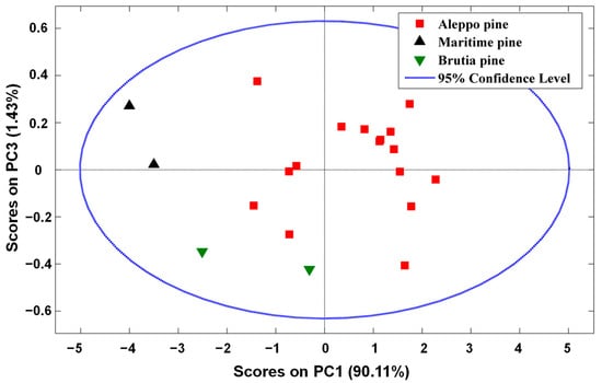 Again, the best predictions were obtained for Maritime and Brutia pine species and the worst prediction involved Aleppo pine species which was slightly misclassified as Brutia pine (6.7%) species, suggesting that the lipid profile of both these species are very similar. Nonetheless, around 93% of correct predictions were obtained for Aleppo pine species. Once more, these results are in agreement with the obtained results with PCA (Figure 2) and PLS-DA when using NIR spectra.