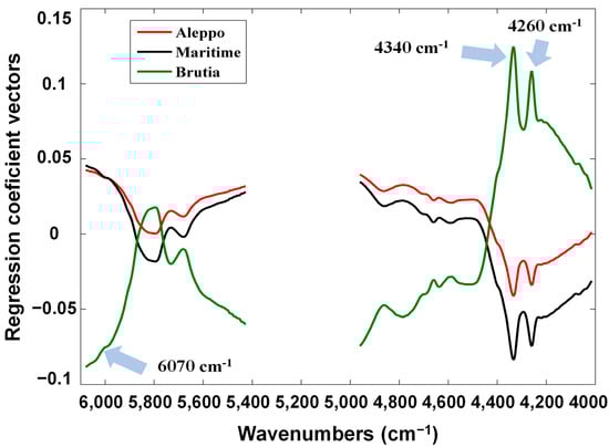 Besides providing the total amount of correct predictions, the confusion matrices also revealed the species that were the best and worst predicted. The Maritime and Brutia pine species were the best-predicted species with a total of 100% of correct predictions. The worst results were obtained with the prediction of Aleppo pine species where one validation sample was confused with Brutia pine species. Nonetheless, around 93% of correct predictions were obtained for Aleppo pine specie. These findings agree with the obtained results with PCA (Figure 2) where it can be observed that the Brutia pine species clustered closely to Aleppo pine species. The results obtained with PCA and PLS-DA seem to indicate that these species are very similar in their NIR spectra. Nonetheless, the obtained results (around 95% of total correct predictions) attest the suitability for discriminating pine seeds species with NIR spectroscopy. With the objective of understanding the more important spectral regions for the developed PLS-DA, the respective regression coefficient vectors were depicted in Figure 3.