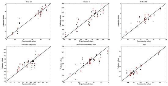 The obtained R2P for most of the compounds assessed were higher than 0.75 which indicates that is possible to quantify the amount of lipids through the NIR spectra of pine seeds. The best PLS models were obtained for total fat, vitamin E, saturated and monounsaturated fatty acids, C20:2, C20:1n9, C20, C18:2n6c, C18:1n9c, C18 and C16:1. These results are in agreement with the findings of Galtier et al. (2007) [31] who also established accurate PLS models for the prediction of the major FAs with excellent prediction abilities for C16:1 (R2 = 0.85), C18:1 (R2 = 0.97), C18:2 (R2 = 0.98), C20:1 (R2 = 0.88). For saturated and monounsaturated fatty acids, our results are well in line with the findings of Mossoba et al. (2013) [32] who reported PLS-R models with a values of R2 equal to 0.9957 and 0.9993, respectively.