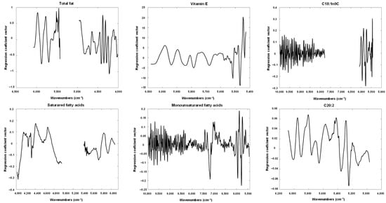 Regression coefficients vectors of the best PLS models built for total fat, vitamin E, C18:1n9c, saturated fatty acids, monounsaturated fatty acids and C20:2.