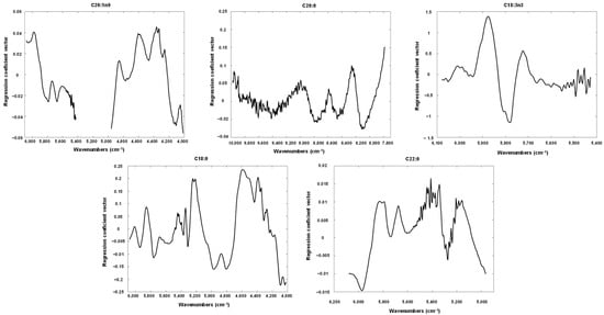 Regression coefficients vectors of the best PLS models built for fatty acids C20:1n9, C20:0, C18:3n, C18:0 and C22.