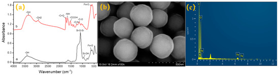 The physical and chemical properties of the prepared composites were characterized by FTIR, SEM, and EDS. As Figure 2a shows, the stretching vibration peaks, including the -OH (3408 cm−1) bond, Si-OH (953 cm−1), and the Fe-O (588 cm−1) bond, appeared in the basic composite, and the final FTIR spectrum had the same peaks as the raw material. In addition, the peaks of the -N-H (1651 cm−1), -C=O (1723 cm−1), and -COOH (1531 cm−1) belonging to carboxyl were found in the final composite as well. These data indicated that the synthesis was successful and that the carboxyl group was successfully coupled to the magnetic beads [24].