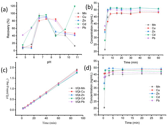 (a) Effect of initial solution pH; (b) Effect of adsorption time; (c) Pseudo-second-order kinetic model for adsorption; (d) Effect of the eluent time for Mn, Cu, Zn, Cd, and Pb.
