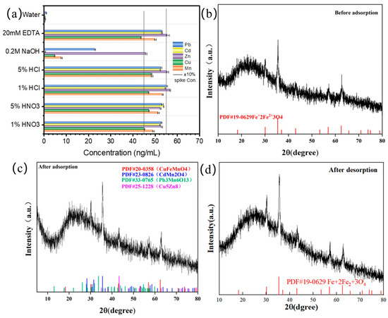(a) Effect of the eluent condition for Mn, Cu, Zn, Cd, and Pb; (b) XRD pattern before adsorption; (c) XRD pattern after adsorption; (d) XRD pattern after desorption.