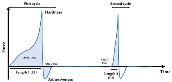 Textural properties were calculated from the force–time curve as per Equations (2)–(4) [24].