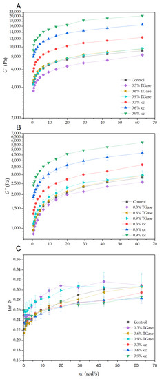 (A) Storage modulus (G′); (B) loss modulus (G″); and (C) loss tangent (tan δ = G″/G′) vs. angular frequency of printing material treated with TGase and κc at 0.3, 0.6 and 0.9%.