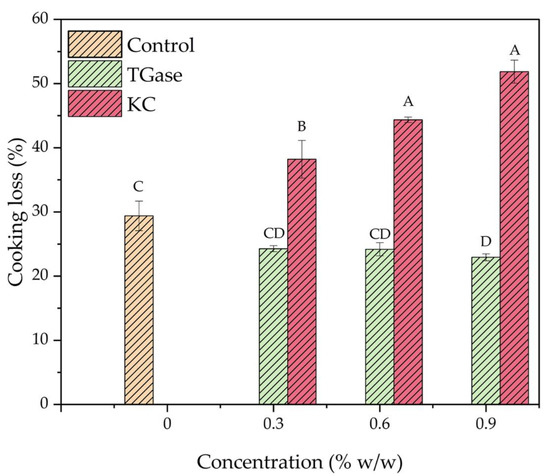 Cooking losses of meat mimics treated with TGase and κc are shown in Figure 5. Addition of TGase tended to help decrease the loss of moisture, while the samples treated with κc experienced the higher loss of moisture than the control. Increasing the κc content resulted in an increase in the cooking loss, as mentioned earlier. These observations are ascribed to the fact that TGase resulted in the higher ability to retain water within the printed meat mimics as a result of enzymatic crosslinking. κc, on the other hand, did not exhibit such a capability. Cooking losses of the control, samples treated with TGase at 0.3%, 0.6%, 0.9% and samples treated with κc at 0.3%, 0.6% and 0.9% were 29.39, 24.27, 24.18, 22.93, 38.21, 44.36 and 51.85%, respectively.