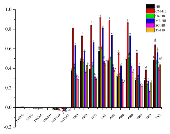 E-nose response value plot for original and fermented highland barley samples: HB (original highland barley), CM-HB (fermented highland barley with C. militaris), SR-HB (fermented highland barley with S. rugoso-annulata), ME-HB (fermented highland barley with M. esculenta), SC-HB (fermented highland barley with S. commune), TS-HB (fermented highland barley with T. sanguinea). Different superscript lowercase letters in a row (a–f) represent statistically significant differences between the mean values at p < 0.05 determined by one-way ANOVA.