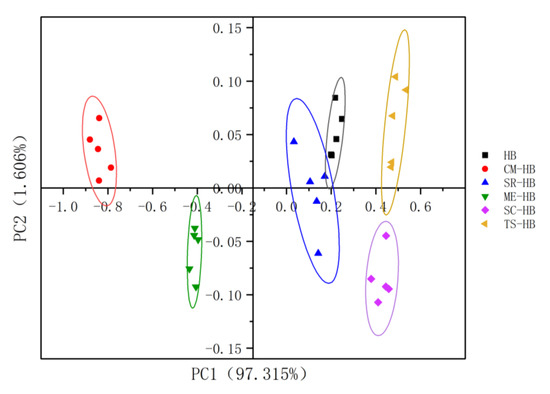 PCA is a statistical tool to explain the differences between samples by their principal components. In general, the feasibility of the method can be considered when the total contribution rate exceeded 85% [25]. As shown in Figure 2 the contribution of PC1 was 97.32% and of PC2, 1.61%, with a cumulative contribution of 98.921%, indicating that the electronic nose analysis could represent most of the volatile flavor information of the different samples. The results showed clustering of samples in the PCA plot [26]. There was partial overlap between SR-HB and HB. SC-HB and TS-HB were located on the right side of the X-axis. However, ME-HB and CM-HB were located on the left side of the X-axis. The results indicate that the volatile odorants varied significantly among all the samples fermented with different edible mushrooms.