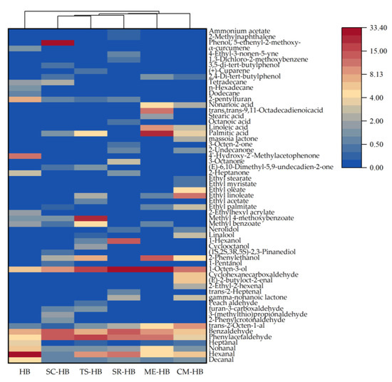 The heatmap based on the type and amount of volatile compounds is shown in Figure 4. The differences between various volatile compound levels are represented by different shades of color, which enable a more visual display of differences between samples [38]. It is relatively clear from the thermogram that fermentation with mushroom mycelium increases the abundance of volatile compounds and improves the aroma of highland barley. After fermentation, the original grassy and astringent taste of highland barley disappeared due to the reduction in decanal, hexanal and heptanal. The increase in phenylacetaldehyde, benzaldehyde and 1-octen-3-ol brought floral, sweet and mushroom aromas to the fermented highland barley. It is obvious from Figure 4 that among the volatile compounds in CM-HB samples, esters, including methyl benzoate (Honey, Flowers), ethyl palmitate (Fragrance, Milk), ethyl linoleate (Fatty), ethyl oleate (Cocoa), ethyl myristate (Iris aroma, Fat), andethyl stearate (Slightly waxy, Irritating), and some alcohols such as linalool (Floral, Lily of the valley) and nerolidol (Green, Floral, Fruity aromas) are relatively high in content. ME-HB contains some ethyl linoleate, methyl benzoate and ethyl palmitate with an overall floral, sweet and oily aroma, but also has a relatively high content of unsaturated fatty acids. The relatively high content of 3-(methylthio)propionaldehyde (Stench) in SC-HB and the high content of methyl 4-methoxybenzoate (Peppers, Herbs, Dried fruits) in TS-HB had a negative effect on the overall flavor presentation. Meanwhile, the SR-HB sample was richest in aroma composition among the six samples.