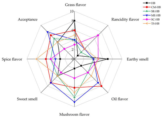 Sensory evaluations of the original and fermented highland barley were performed by direct sniffing and flavor-profile mapping. As shown in Figure 5, the original highland barley had a relatively strong grassy and earthy taste with moderate acceptance, but the flavor profiles were changed after fermentation. The flavor of highland barley was decreased after fermentation with S. commune and T. sanguinea, which was consistent with the results of ROAV. SC-HB showed a heavy sour and fermented odor with a low overall acceptability. TS-HB had a light overall odor with a strong spicy odor resulting in a lower acceptability of the sample. Fermentation with C. militaris, S. rugoso-annulata and M. esculenta showed significant improvement in sensory characteristics. Among them, the samples fermented with M. esculenta showed a significant sensory flavor improvement. This was in agreement with the results of GC-MS.
