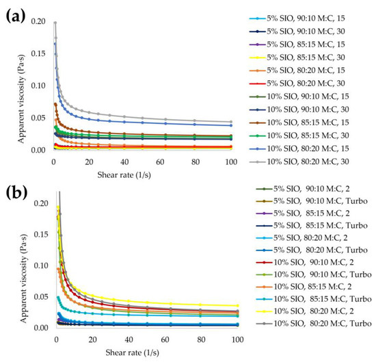 The apparent viscosity of different emulsions as a function of shear rate are shown in Figure 1. From this figure, it can be affirmed that the emulsions present a pseudoplastic behavior, characteristic of those fluids that decrease their viscosity as the applied shear rate increases [45]. The viscosity values at a shear rate of 50 s−1 varied within the range of 0.004 and 0.040 Pa·s for CH (Table 1) and 0.005 and 0.042 Pa·s for US (Table 2). It was found that the emulsions that presented higher viscosity for the two technologies were those elaborated with a higher concentration of oil (10% w/w) and a higher proportion of wall material (80:20 w/w).