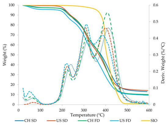 The thermal stability of the microcapsules was evaluated by thermogravimetric analysis (TGA) using an SDTQ600 (TA Instruments, New Castle, DE, USA) following the methodology use by Amaya-Cano et al. [34]. The thermograms of the pure components, maltodextrin, and sodium caseinate were taken from the study performed by Amaya-Cano et al. [34]. The analysis of the oil component was performed to corroborate the presence of the active component (sacha inchi seed oil) in the microcapsules.