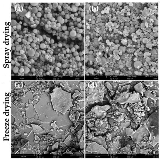 Scanning electron microscopy images. (a) Conventional homogenization spray-drying, (b) Ultrasound probe homogenization spray-drying, (c) Conventional homogenization freeze-drying, (d) Ultrasound probe homogenization freeze-drying.