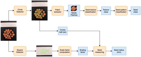 The proposed algorithmic pipeline (represented in Figure 2) consisted of several steps aimed at extracting information about the image contents. In more detail, the full image was processed by the “square detector” module in charge of the identification of the seeds in the image. Detected circles were then employed on one side to extract the patches of the lentil seeds and, on the other side, to retrieve the average seeds’ radius in pixels. Other than that, the original images were also processed by the “square detector” exploiting the graph paper as a reference to detect the small squares. The detected squares were then used to compute the scaling factor, which is useful for estimating the average seeds’ radius in millimeters. In addition, the extracted patches were provided, one by one, as input to the seed texture classification module returning their texture class (rare, sparse, dense). Subsequently, a seed pattern classification module was employed to define the seed class estimation (absent, dotted, spotted, marbled, complex).