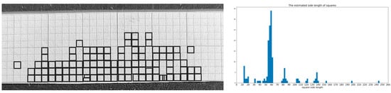 Figure 3 shows the process on the graph paper of the image corresponding to the lentil grain sample n. 6. It is worth noting that only a portion of squares was detected because not all the sides of the squares could be retrieved, even after image enhancements. Anyway, the detected squares were enough to build reliable statistics for estimating the length of the sides.