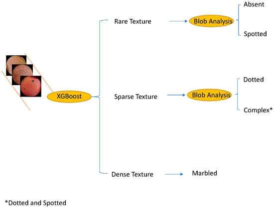 The algorithmic details of the methodological steps are detailed in the following steps. In the first step, the local binary pattern (LBP) descriptors [19] were computed in each circular area extracted as described in the previous section. The length of the LBP descriptor was 18. To the end of each LBP descriptor, a 180 bins histogram was attached to collect information about each color channel (60 bins for each RGB channel). As a result, the feature vector consisted of 198 items describing the color and the texture. These vectors were used then to train a tree-based ensemble method named XGBoost [20]. Once each seed was classified as one of the three classes, a morphological region analysis was applied to determine if a rare texture corresponded to an absent or spotted subclass and if a sparse texture was relative to a dotted or complex subclass. The morphological analysis [21] aimed at separating relevant patterns (foreground) from the uniform surface of the seeds (background). The analysis consisted of several sequential steps: edge detection using the Canny operator with adaptive threshold, connectivity analysis, closing operation (dilation and erosion using the same rectangular structuring element for both operations), contour following, and, finally, the area computation of the detected regions. Among the seeds with rare texture, those with no significant regions were labeled as absent, whereas those with a few regions were labeled as spotted. On the other hand, among the seeds with sparse texture, those with large regions covering more than 50% of the surface were labeled as complex, and the remaining ones were labeled as dotted.