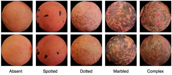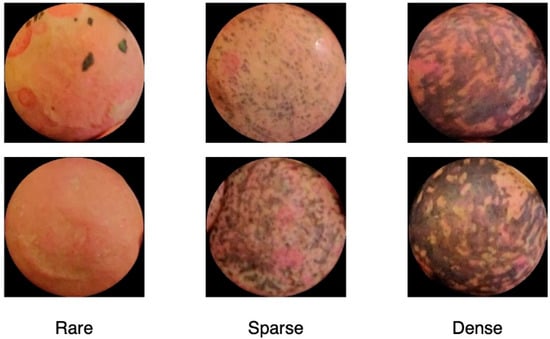Some examples of rare-, sparse-, and dense-textured seeds are reported in Figure 5. In the second algorithmic step, the patches having rare texture patterns are disambiguated and definitively classified as absent or spotted, whereas the patches with sparse-textured patterns are labeled as dotted or complex. Densely textured patches were directly labeled as marbled.