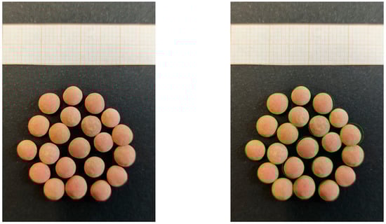 In Figure 7, the outcomes of the processing of image 39 are reported. On the left, the whole image is reported to show the graph paper pictured on the top, from which it was possible to estimate the scale factor. In this example, each mm was estimated as containing about 56.64 pixels, and then the scale factor was S = 0.01765. On the right, the outcomes of the algorithm aiming at finding circular shapes are reported. In the image of lentil sample n. 20, the seeds were correctly detected (one was missed on the top-left part, which could be due to defocusing that led to the partial detection of edge points). No circle was discarded by radiometric or statistical checks since all the detected circles fitted actual seeds.