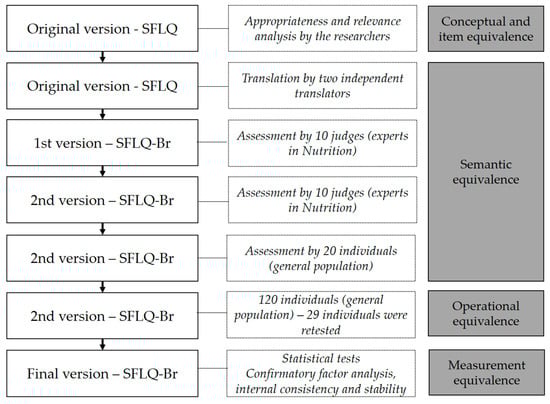 The cross-cultural adaptation and content validity of the SFLQ followed the universalistic approach, which involves the assessment of equivalence between the original instrument and the instrument being adapted. The adapted version is called SFLQ-Br in this work. The process of the SFLQ-Br adaptation and validation was organized into four steps: (1) conceptual and item equivalence; (2) semantic equivalence; (3) operational equivalence; (4) measurement equivalence [,]. Figure 1 depicts the study flow, including the sample and process of each step. The research was conducted from October 2021 to April 2022.