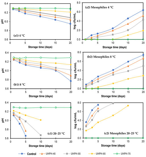 pH and mesophilic bacteria counts (cfu/mL) in untreated (control) and ultra-high-pressure-homogenized fish broths at 300 MPa at different inlet temperatures (45, 55, 65, and 75 °C) during storage at (a1,a2) 4 °C, (b1,b2) 8 °C, and (c1,c2) room temperature (20–25 °C).