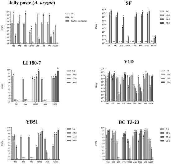 Evolution of microbial counts over 20 days of fermentation of Jellyfish-based food products inoculated with selected yeast strains. Jelly paste (Aspergillus oryzae): product obtained by the first fermentation step (solid-state fermentation) performed by inoculating the Koji starter (A. oryzae) into Jellyfish puree (consisting of jellyfish, starch and wheat bran). SF: spontaneous fermentation of uninoculated Jelly paste, as control. Y1D: Metschnikowia sp., YB51: Candida parapsilosis; BC T3-23: Debaryomyces hansenii; LI 180-7: Saccharomyces cerevisiae. The initial inoculum of the four yeast starter strains (LI 180-7, YB51, BC T3-23, Y1D) was about 107 CFU/g. Microbial parameters: TBC (total bacterial count, accounting for aerobic colony count), BAC (Bacillus spp.), CPS (presumptive coagulase-positive staphylococci), PTS (presumptive total staphylococci), YDRBC (total yeast count), MDRBC (total mold count), MGS (MRS glucose seawater salts), MSS (MRS sucrose seawater salts), NAS (nutrient agar seawater salts). Media where microbial counts were equal to zero were not reported. For each fermented sample, microbial parameters were individually submitted to one-way analysis of variance (ANOVA), and Tukey’s post hoc method was applied to determine significant differences (p < 0.05) among the microbial counts at different time points (as showed in the graph legends).