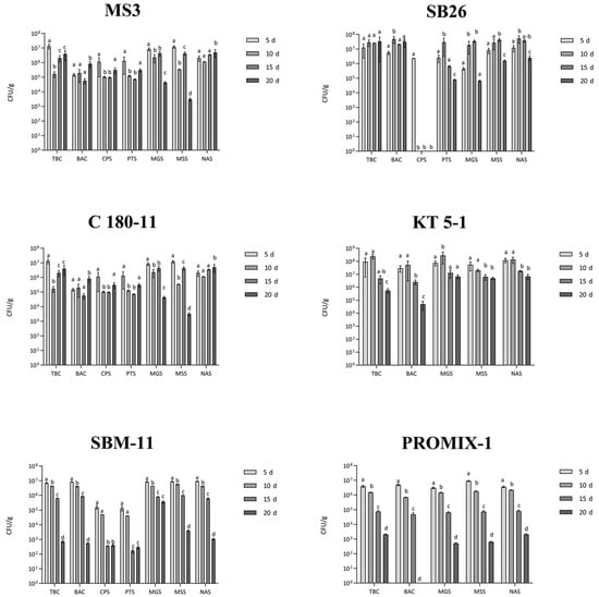 After 20 days of incubation at 28–30 °C, among tested yeast strains, C. parapsilosis YB51 and S. cerevisiae LI 180-7 strongly reduced or eliminated the total bacterial (TBC) and Bacillus spp. counts (BAC) during fermentation, inhibited the development of coliforms, Enterobacteriaceae, E. coli and staphylococci (PST) (Figure 2). The ability of these yeast strains to effectively drive the fermentation was demonstrated by the increasing load of the yeast total count (YsSDA, Figure 2) during the process and by the high count obtained at the end of it.