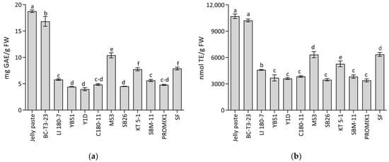 The assay described by Magalhães et al. [41] was used to measure the content of phenolic compounds in fermented Jellyfish pastes. Homogeneous suspensions of samples were prepared by proper diluting, and an aliquot of 50 μL of suspension from each sample was added to 50 µL of Folin–Ciocalteu reagent. After mixing, 100 µL of NaOH 0.35 M was added to neutralize the reaction, and after incubation in the dark at room temperature for 5 min, the spectrophotometric reading at λ = 720 nm was performed. The blank was 50 µL of water added with 50 µL of Folin–Ciocalteu and 100 µL NaOH 0.35 M. The obtained absorbance values were interpolated with the standard curve made using solutions with known concentrations of gallic acid in the range of 2.5–40 mg/mL. Results were expressed as gallic acid equivalent (GAE) per gram of fresh weight (FW).