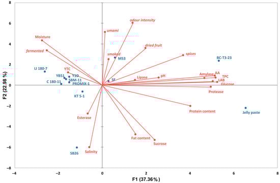 Principal component analysis (PCA) was used to compare important microbiological, chemical and biochemical parameters and sensorial traits associated with the fermented samples. All statistical analyses were carried out using XLSTAT software (Addinsoft Inc., Long Island City, NY, USA).