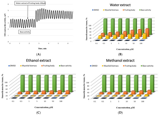 Biological activity of the newly isolated Pleurotus ostreatus strain on the SMPs. (A)—Representative tracing of gastric SM elicited by 100 μM of the applied mushroom extract of the fruiting body; concentration-effect dependence of the effect of mushroom sample (water extract—(B), ethanol extract—(C), and methanol extract—(D)) on the muscle tonus of SM from the stomach (n = 9); base activity is taken as 100%.