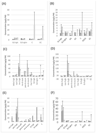 Concentrations of the most representative compound in each seedless grape at each stage of digestion. (A) Autumn Crisp, (B) Pristine, (C) Adora, (D) Melody, (E) Scarlotta, (F) Crimson. ■ Raw material, ■ Oral phase, ■ Gastric phase, ■ Intestinal phase. FW: fresh weight, Delp-3-glc: delphinidin-3-glucoside, cya-3-glc: cyanidin-3-glucoside, mv-3-glc: malvidin-3-glucoside, mv-6-acet: malvidin-3-(6-acetylglucoside), mv-6-caff: malvidin-3-(6-caffeoylglucoside), peo-6-coum: peonidin-3-(6-coumaroylglucoside), mv-6-coum: malvidin-3-(6-coumaroylglucoside), myr-3-glc: myricitin-3-glucoside, Q-3-glc: quercetin-3-glucoside, Q-3-glcn: quercetin-3-glucoronide, GA: gallic acid, GC: gallocatechin, C: catechin, EGCG: epigallocatechin, EC: epicatechin. Data expressed as mean + standard error bar.